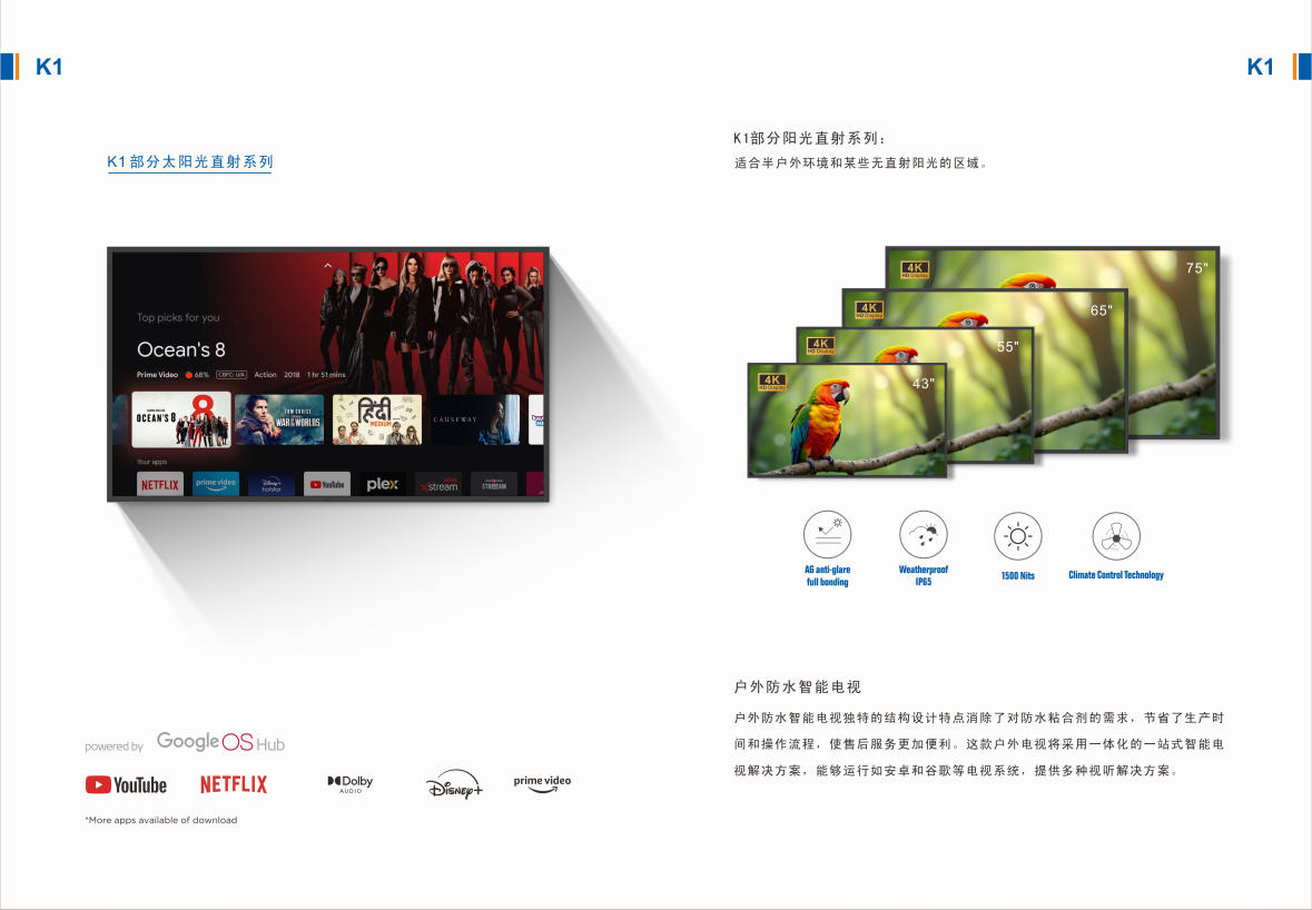 户外防水智能电视独特的结构设计特点消除了对防水粘合剂的需求,节省了生产时间和操作流程,使售后服务更加便利.这款户外电视将采用一体化的一站式智能电视解决方案,能够运行如安卓和谷歌等电视系统,提供多种视听解决方案.适合半户外环境和某些无直射阳光的区域。